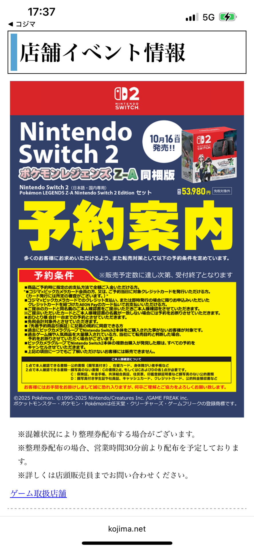 ビックカメラグループのコジマ(コジマ電気)でも、4月24日(木)から、Nintendo Switch2の抽選予約の受付を開始しました!