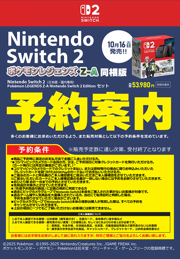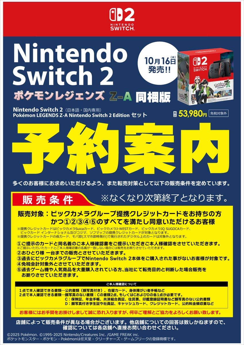 ビックカメラ各店舗、ポケモン レジェンズ Z-A同梱版 Switch2の予約を明日から先着順で受け付け開始!