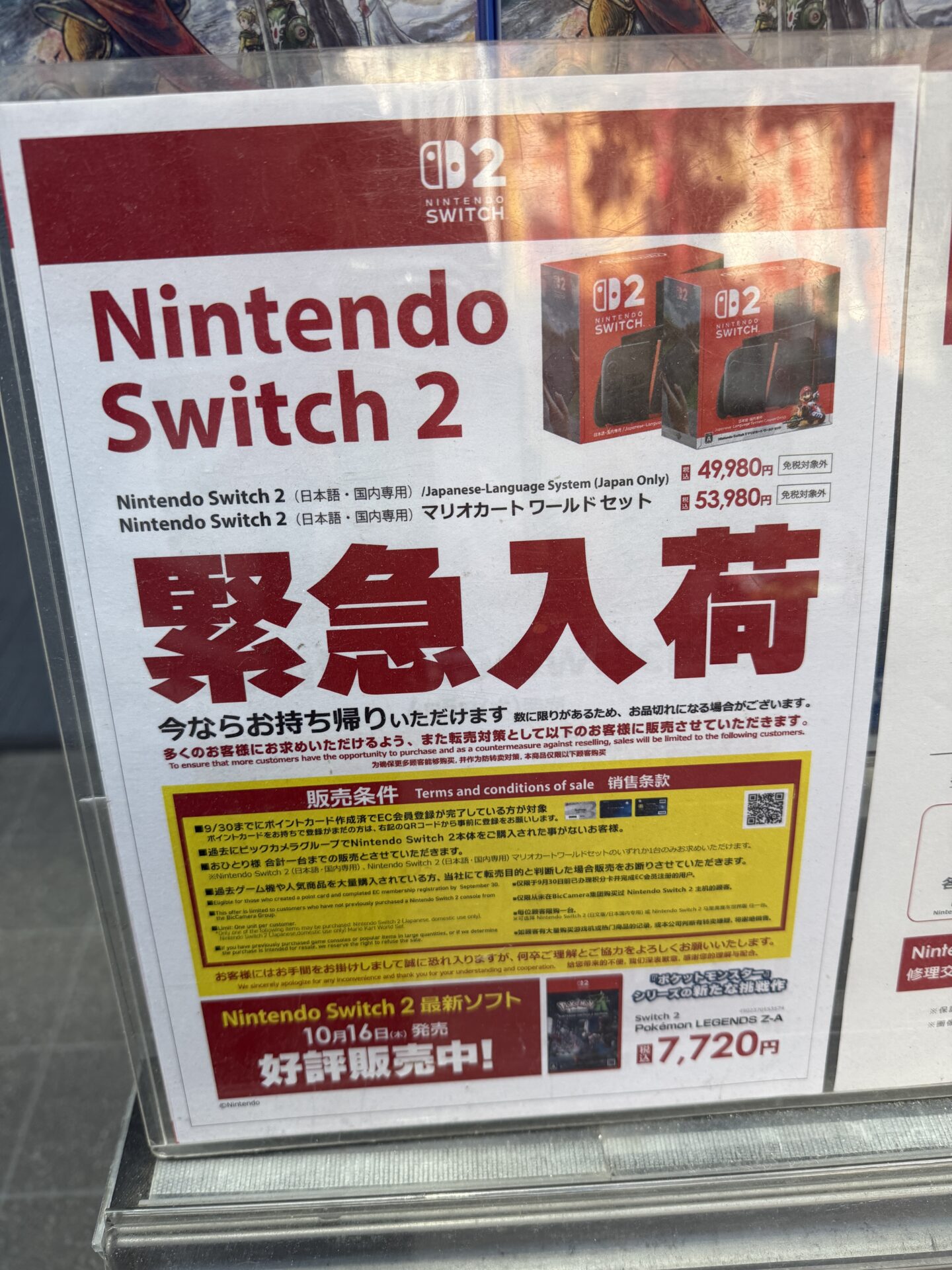 ソフマップAKIBAアミューズメント館でSwitch2購入出来ました!購入条件が9/30以前にECサイトにポイントカード登録のみと難易度低めでした。