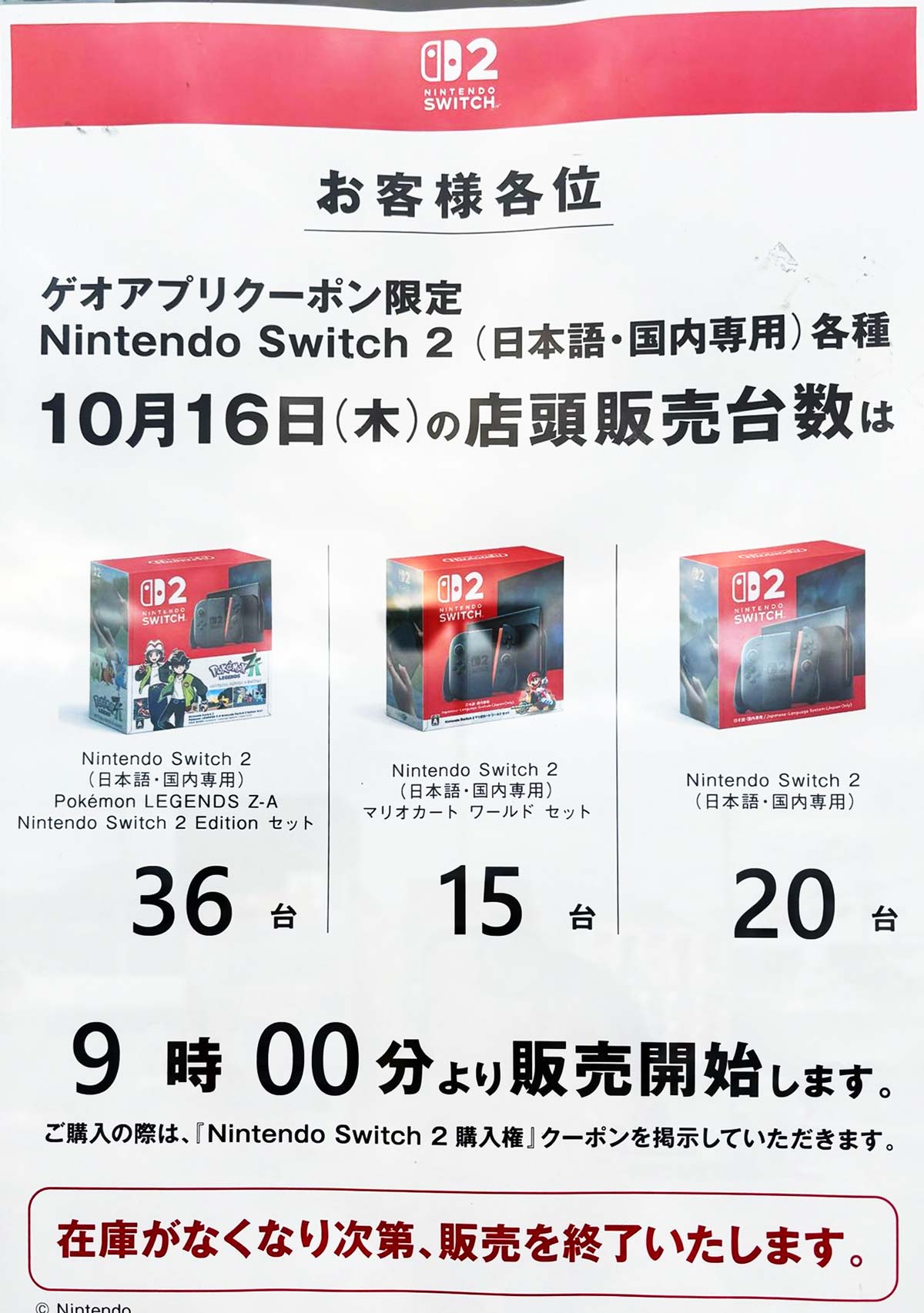 ゲオ Switch2単体、マリオカート同梱版、ポケモンレジェンズ同梱版の販売が9時からです!