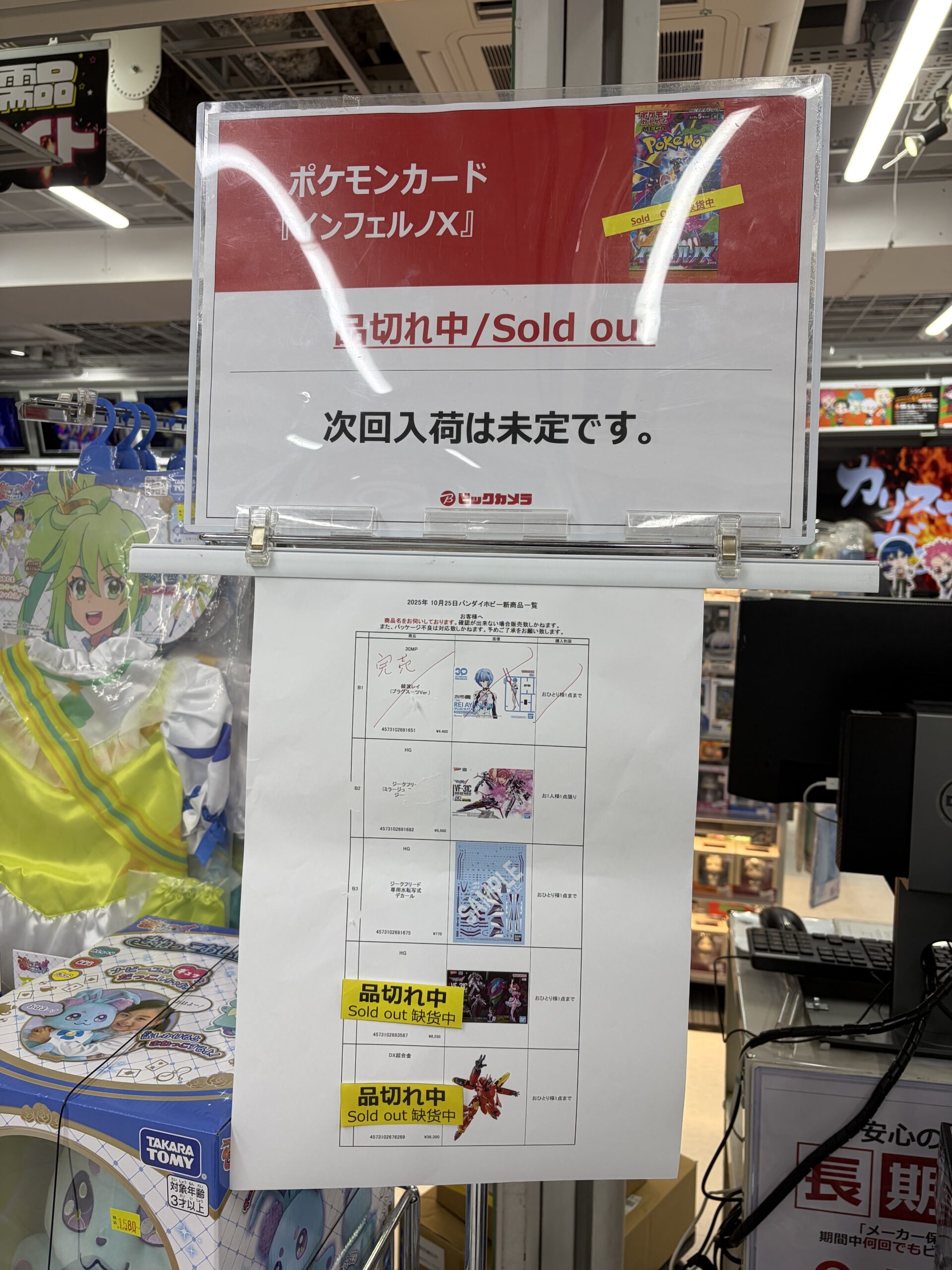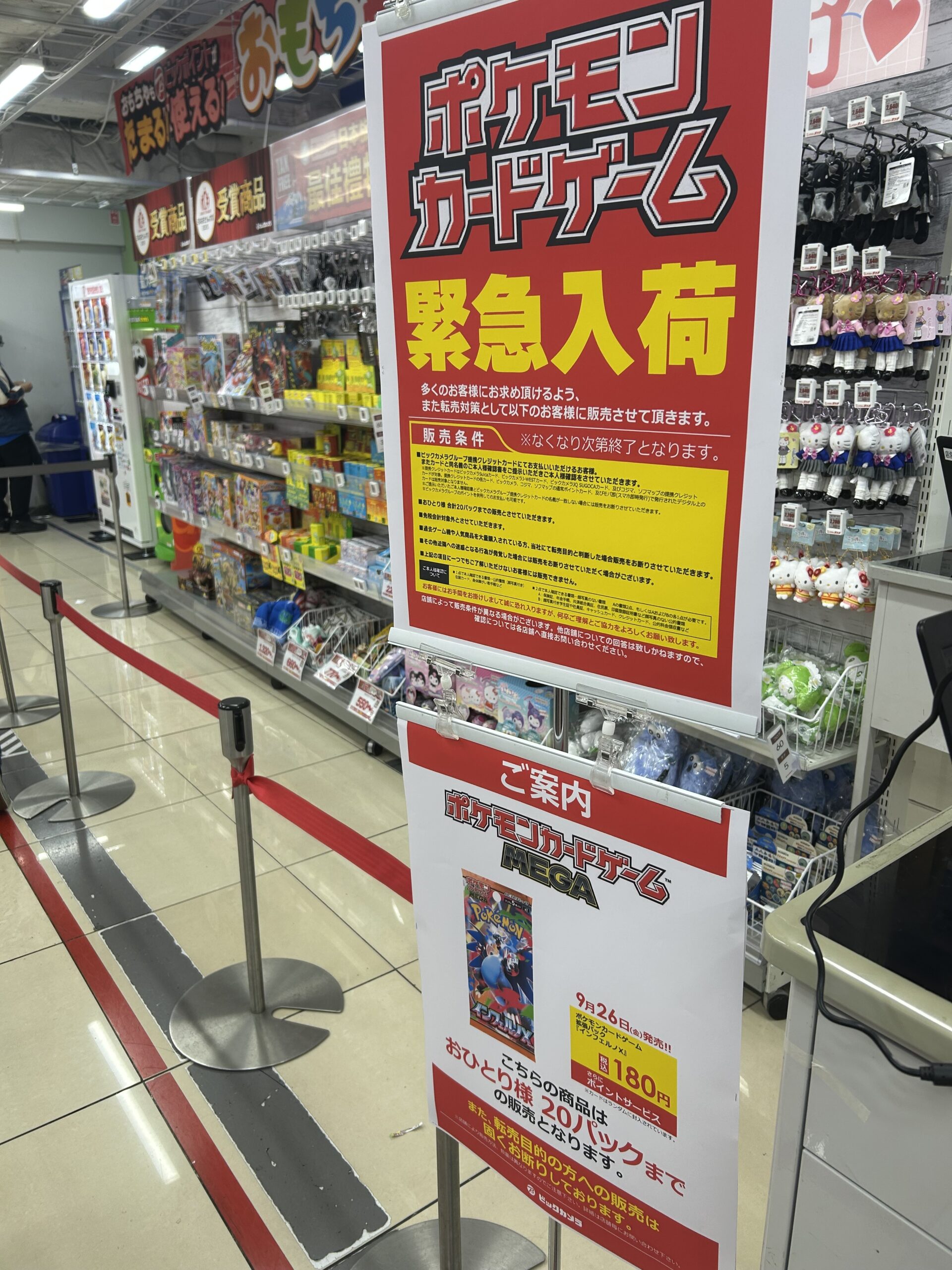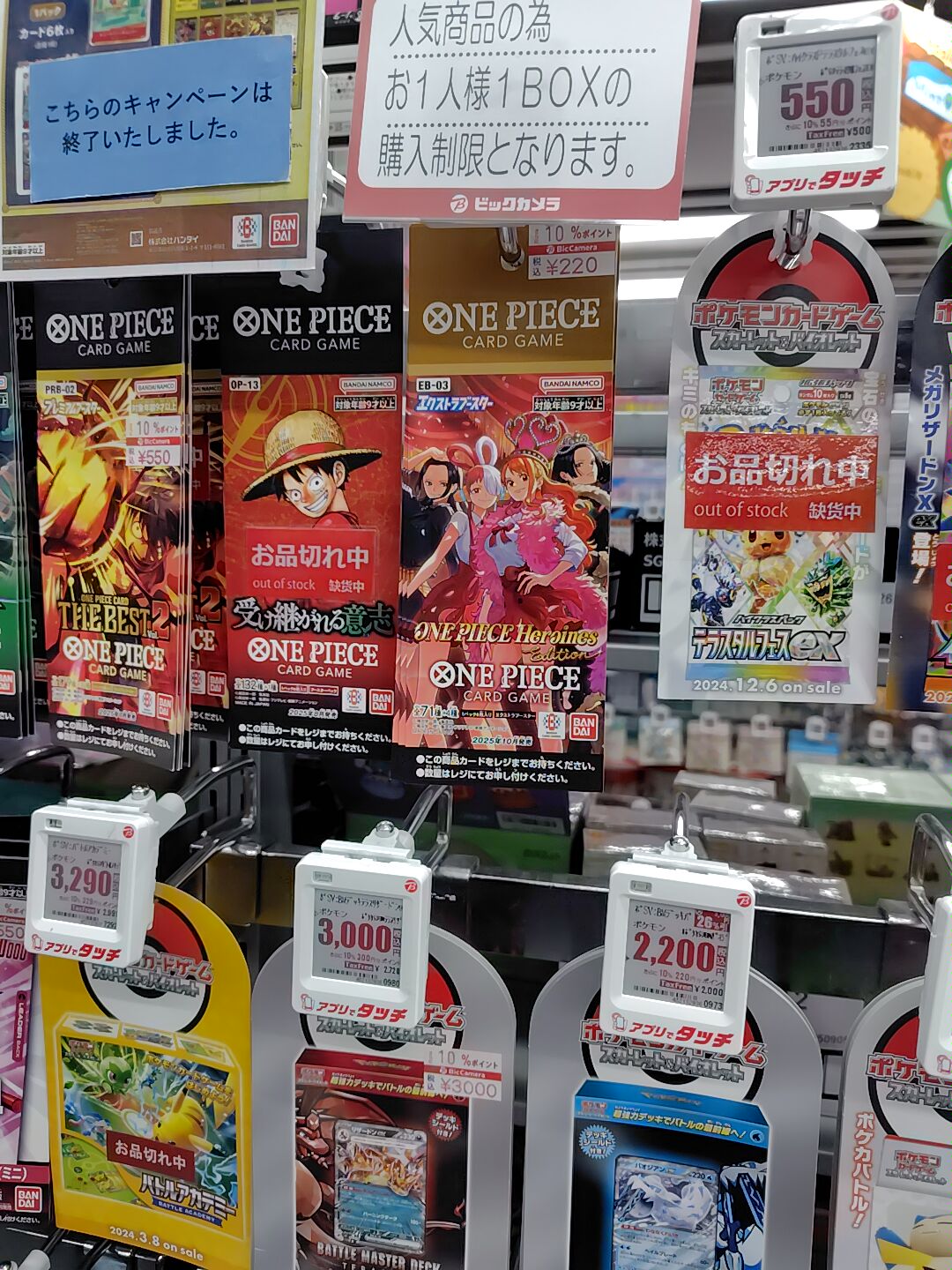 ビックカメラやコジマ店舗でも、毎週の様にポケモンカード、ワンピースカード、遊戯王カードの店頭販売が行われています。