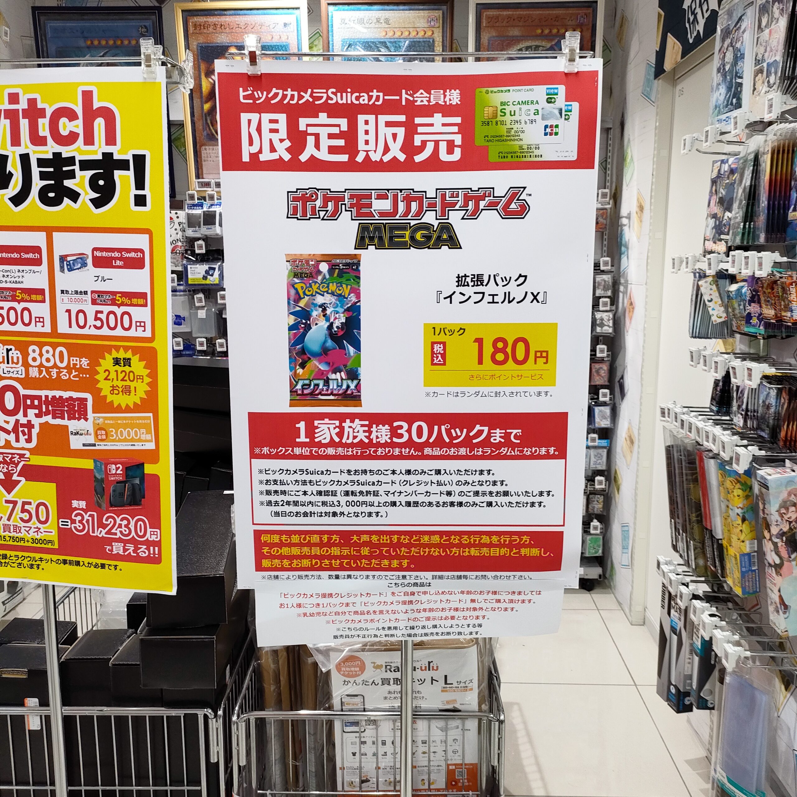 ビックカメラ浜松インフェルノX1人10パック。紙が15枚ずつくらいかけてあって担当者がレジで集めて提げ直すので在庫はわかりません。