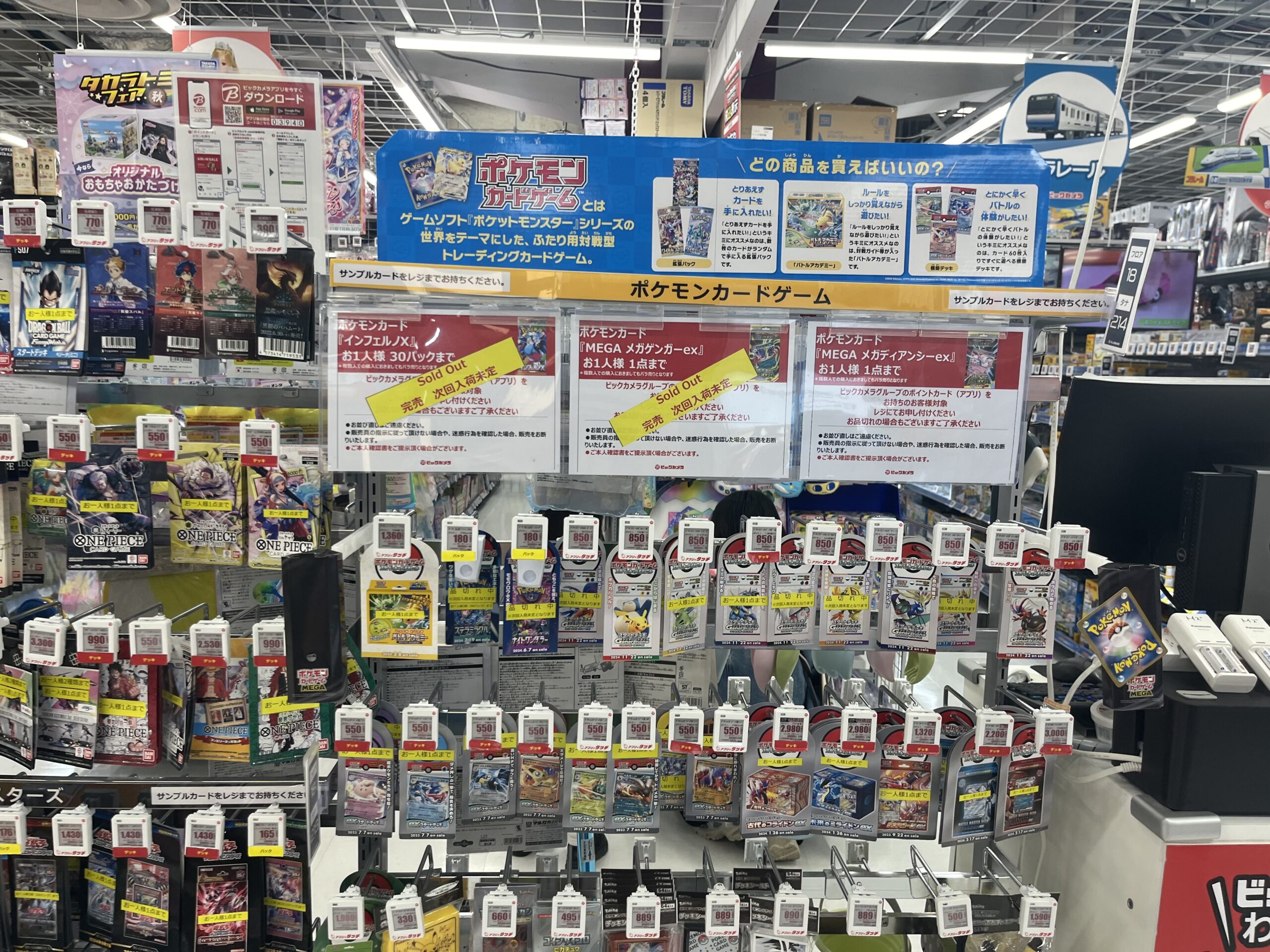 ビックカメラやコジマ店舗でも、毎週の様にポケモンカード、ワンピースカード、遊戯王カードの店頭販売が行われています。