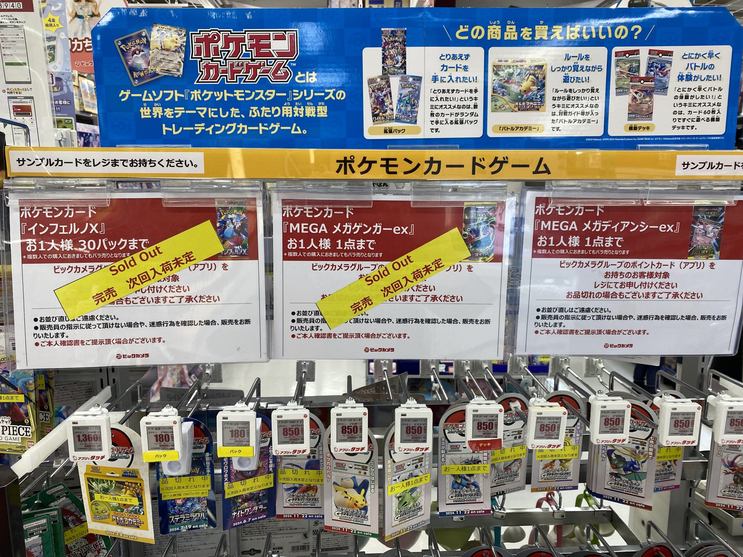 ビックカメラやコジマ店舗でも、毎週の様にポケモンカード、ワンピースカード、遊戯王カードの店頭販売が行われています。