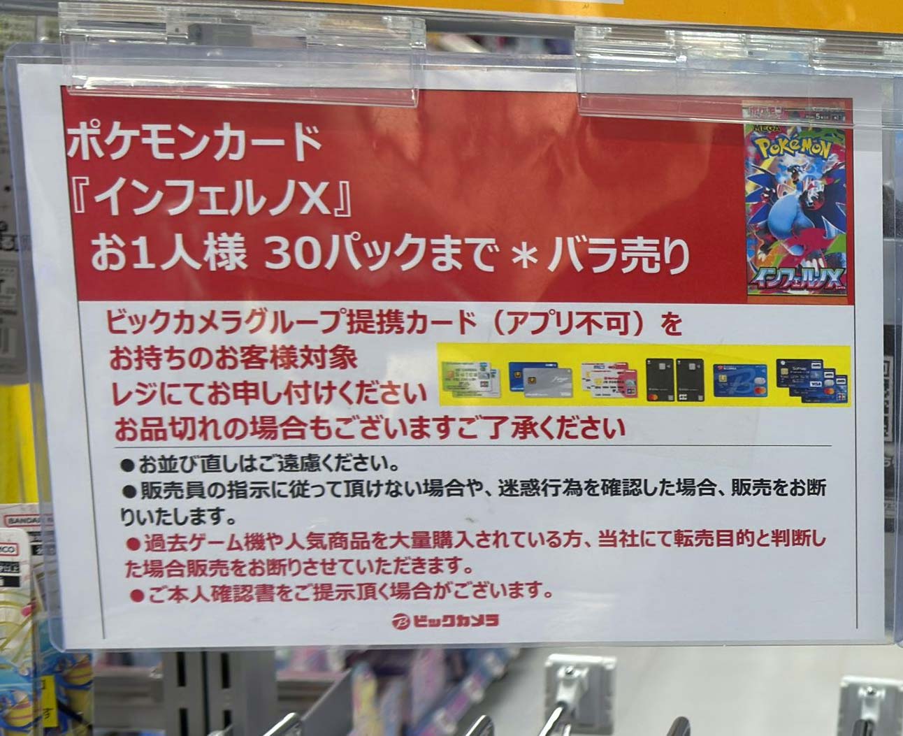 ビックカメラやコジマ店舗でも、毎週の様にポケモンカード、ワンピースカード、遊戯王カードの店頭販売が行われています。