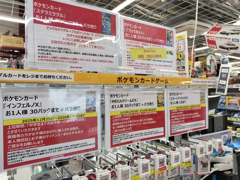 ビックカメラやコジマ店舗でも、毎週の様にポケモンカード、ワンピースカード、遊戯王カードの店頭販売が行われています。