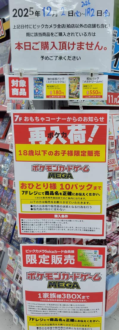 ビックカメラやコジマ店舗でも、毎週の様にポケモンカード、ワンピースカード、遊戯王カードの店頭販売が行われています。