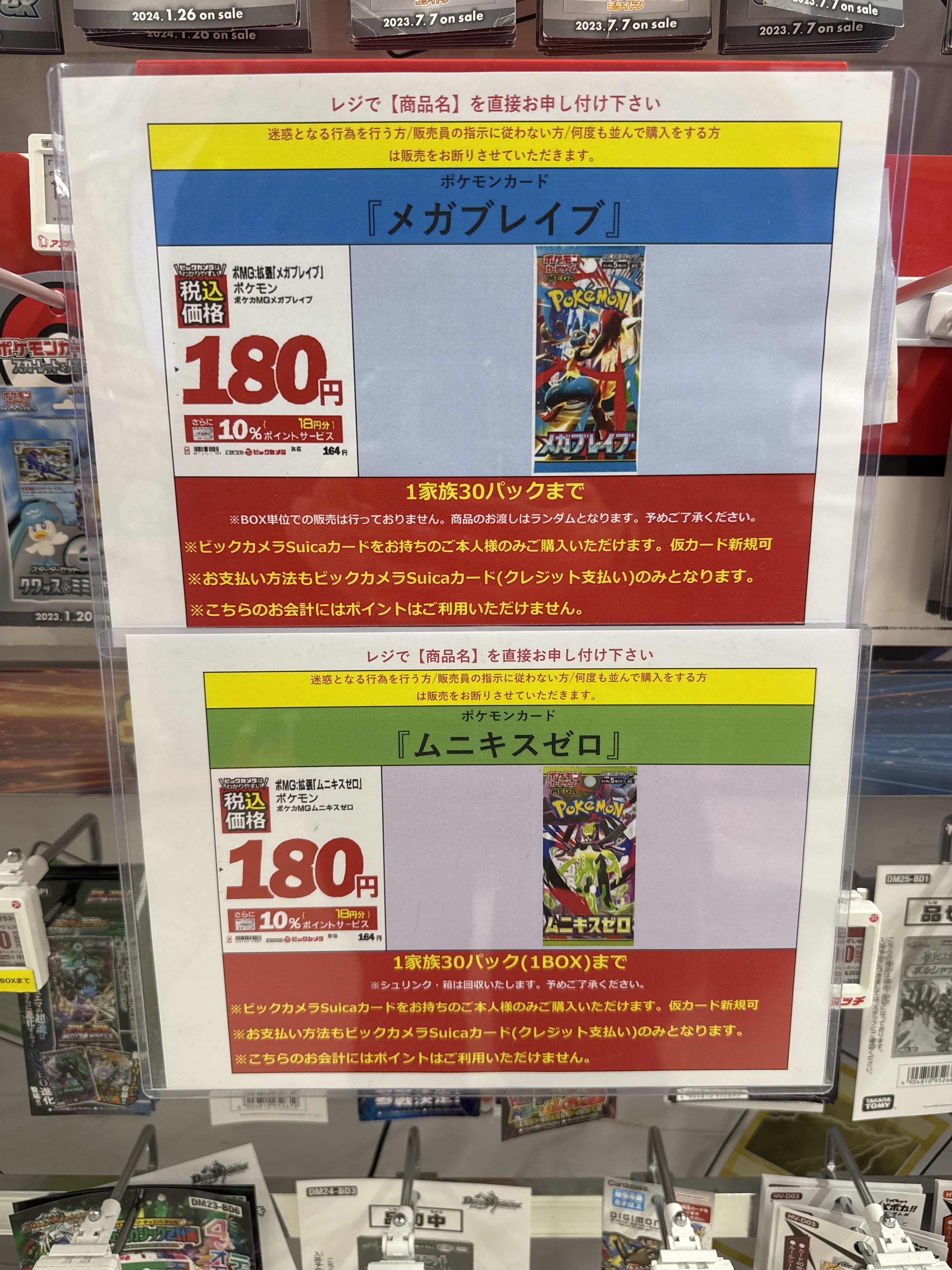 ビックカメラやコジマ店舗でも、毎週の様にポケモンカード、ワンピースカード、遊戯王カードの店頭販売が行われています。