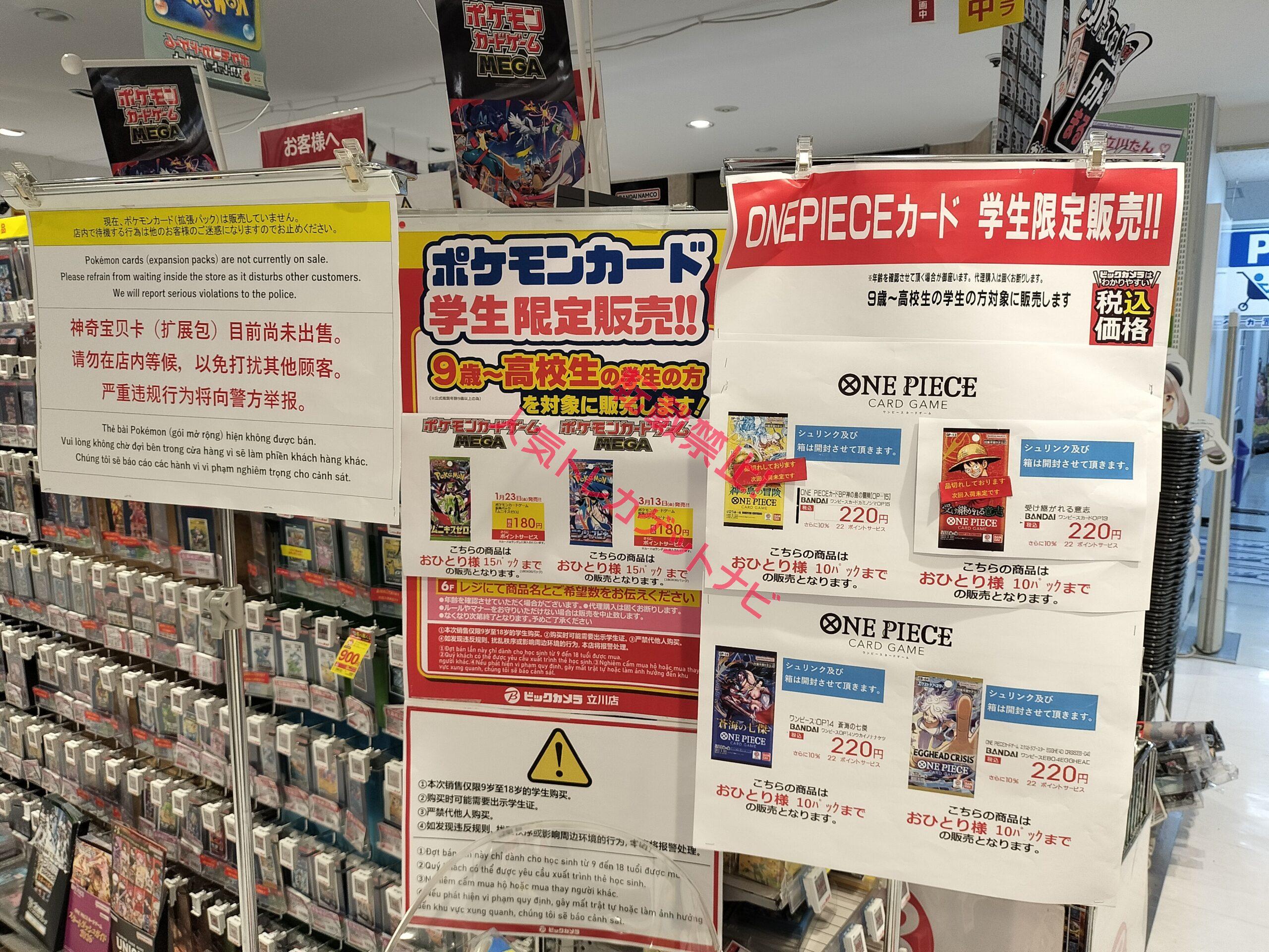 ビックカメラやコジマ店舗でも、毎週の様にポケモンカード、ワンピースカード、遊戯王カードの店頭販売が行われています。