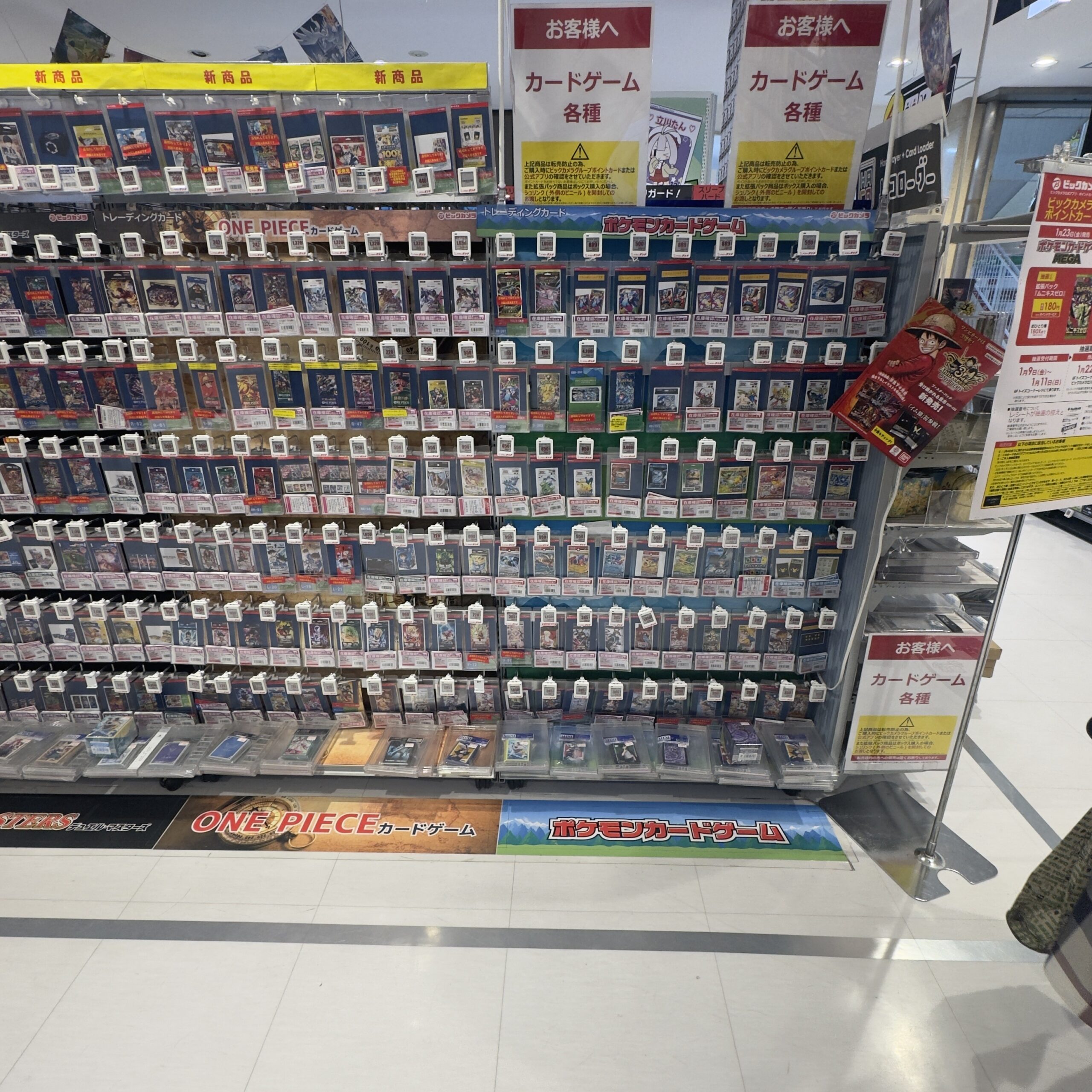 ビックカメラやコジマ店舗でも、毎週の様にポケモンカード、ワンピースカード、遊戯王カードの店頭販売が行われています。