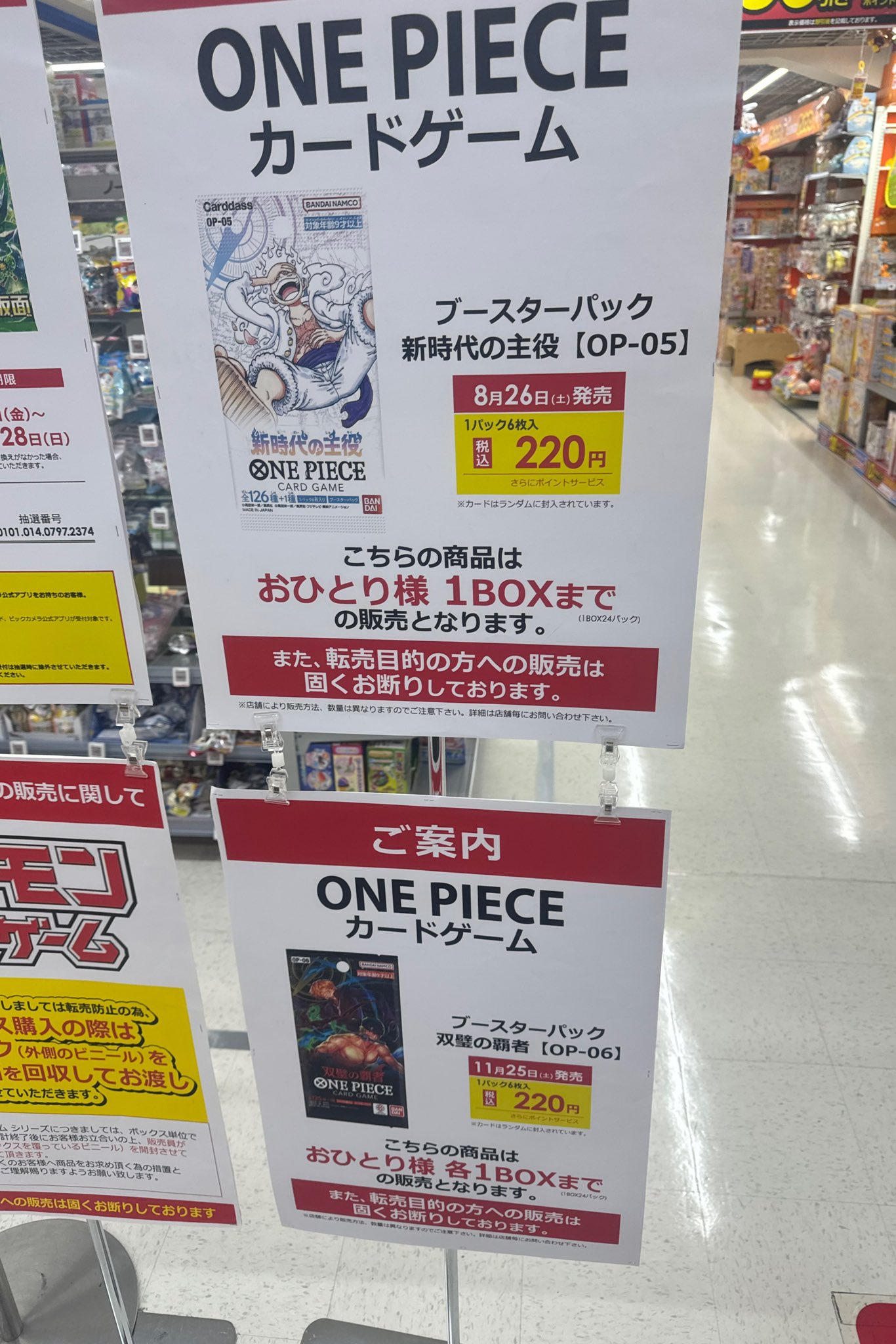 ビックカメラやコジマ店舗でも、毎週の様にポケモンカード、ワンピースカード、遊戯王カードの店頭販売が行われています。