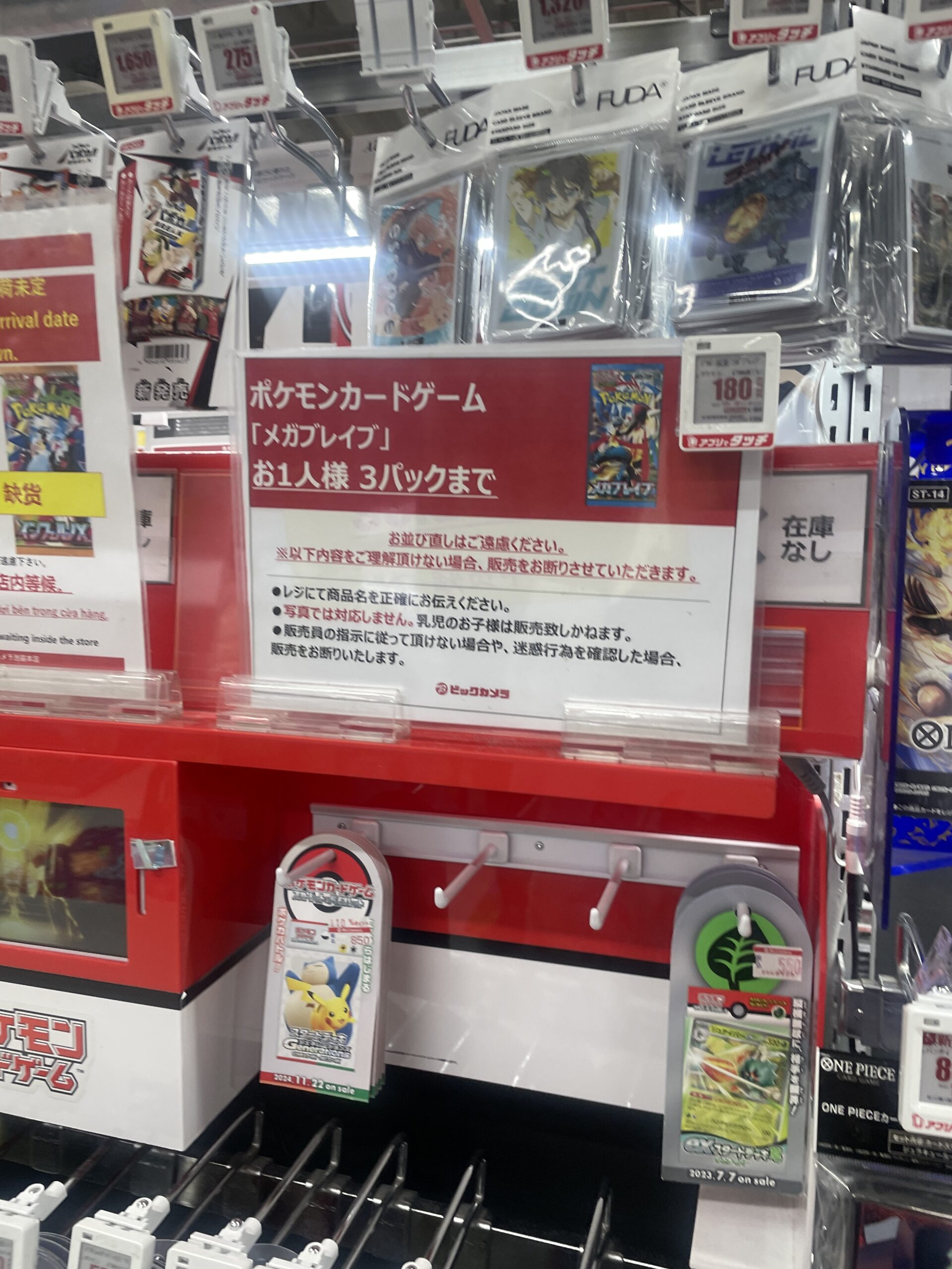 ビックカメラやコジマ店舗でも、毎週の様にポケモンカード、ワンピースカード、遊戯王カードの店頭販売が行われています。