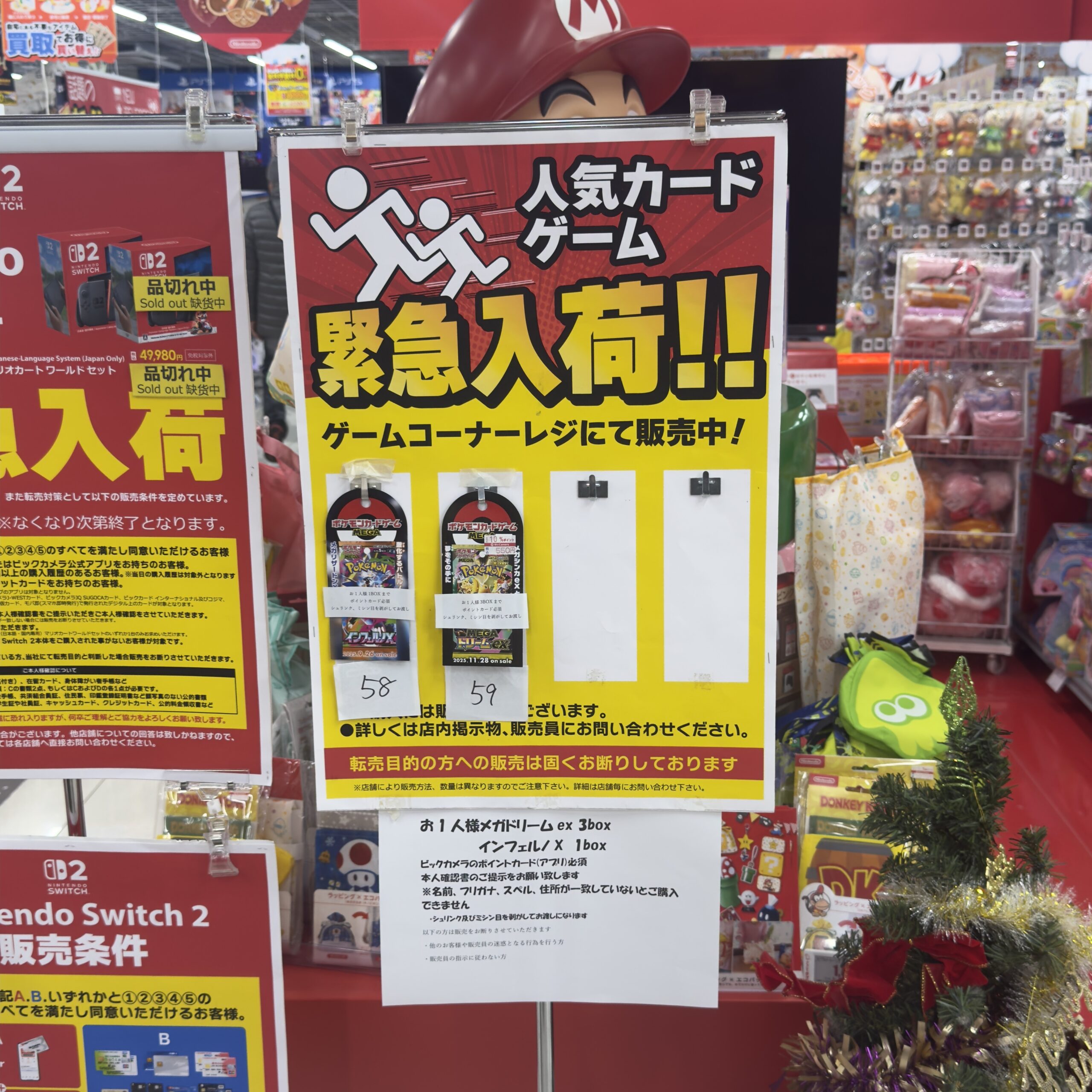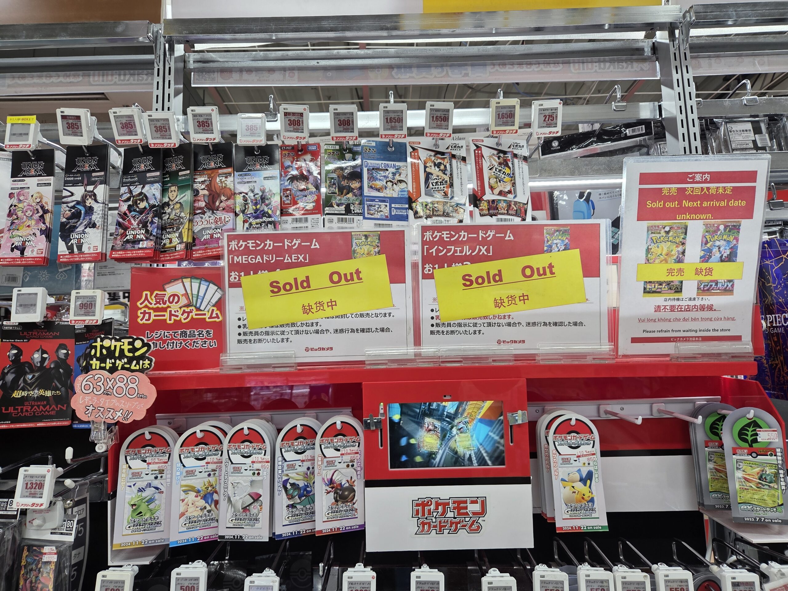 ビックカメラやコジマ店舗でも、毎週の様にポケモンカード、ワンピースカード、遊戯王カードの店頭販売が行われています。