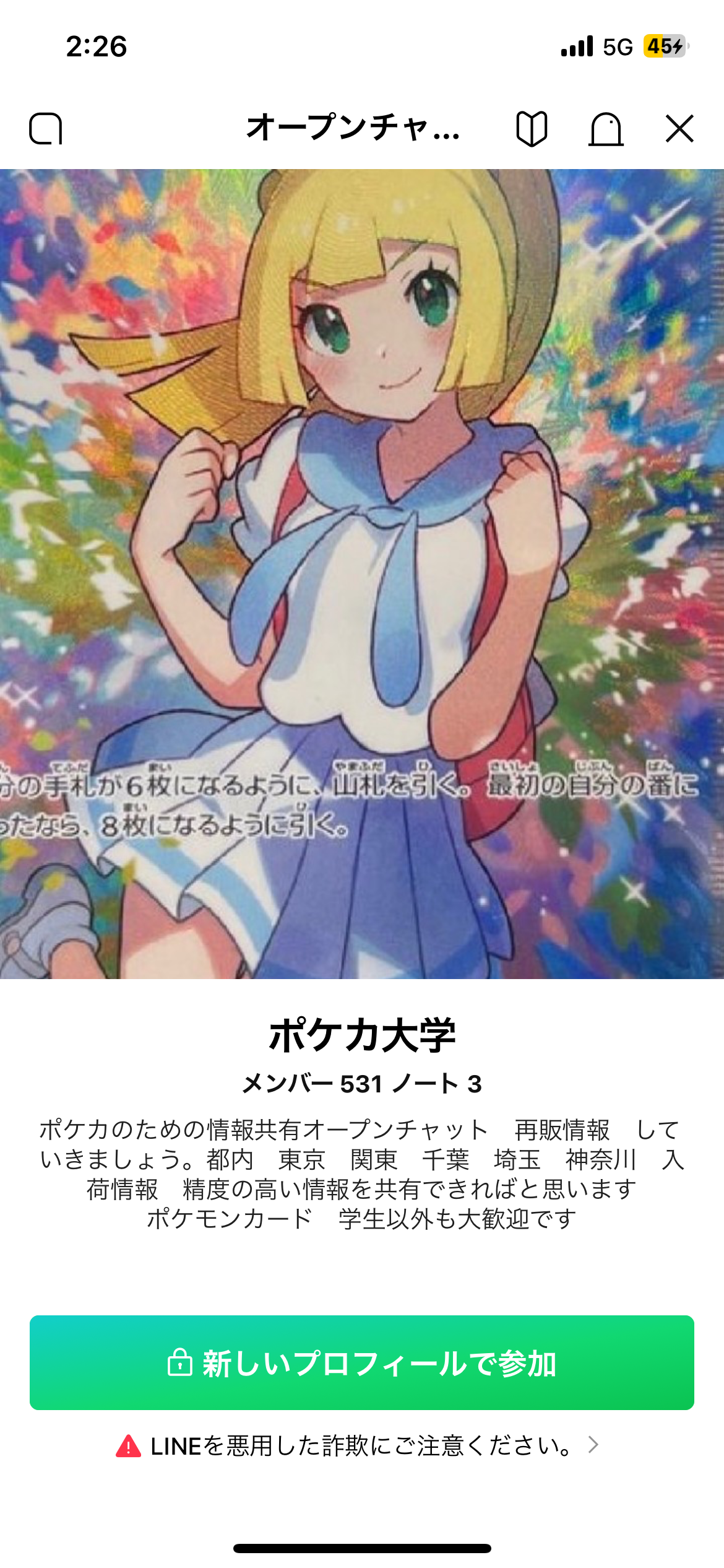 僕らでできる事は通報をしてオープンチャットを凍結させる事だと思います!まずはここの情報を抜いてる規約違反、迷惑行為でポケカ大学を通報しましょう。ご協力お願いします。