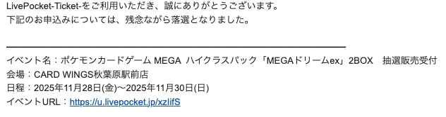 イエサブからメール📩がきましたが、megaドリームexはイエサブ抽選史上過去最大申込数があり、ポケカ抽選では史上最低の当選率になる模様😇