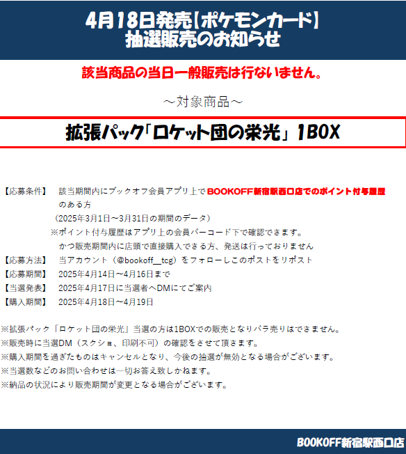 カード◯ボでロケット団の予約又は抽選の発表がまだ未実施の店舗は、おそらく今日が最終決戦(全店舗発表)になるのかなと思われます。