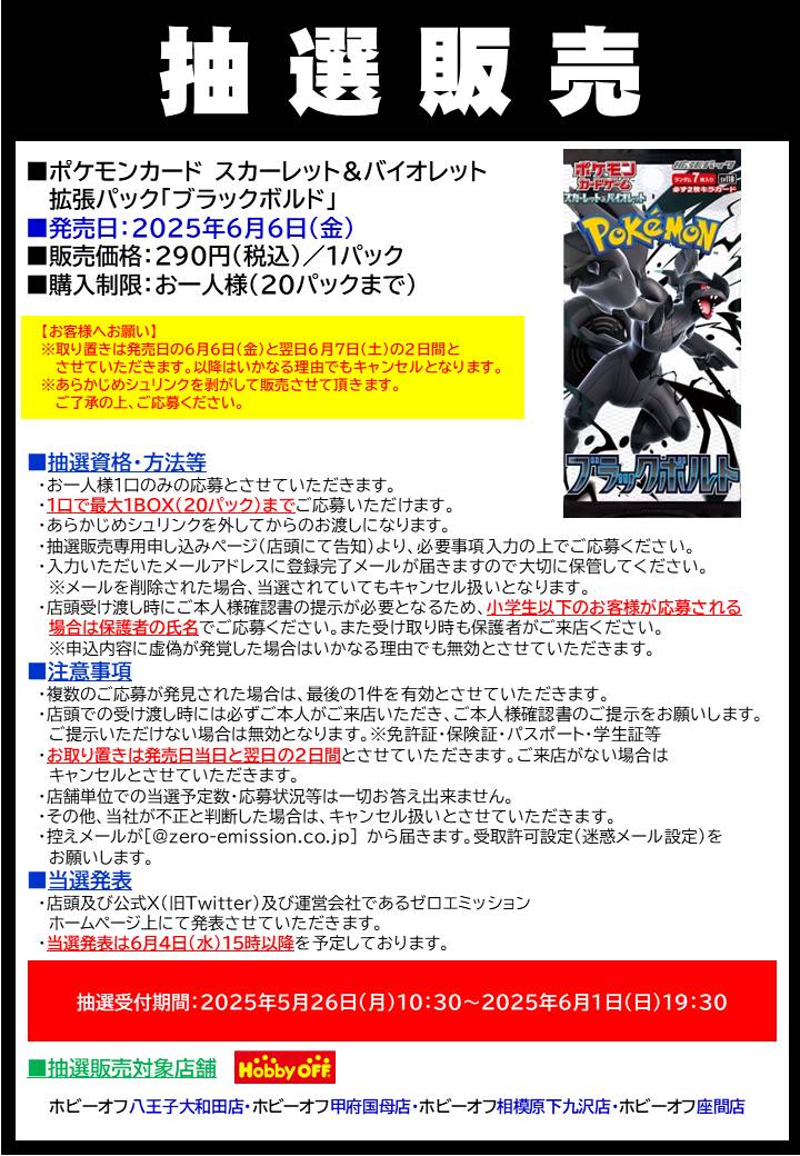 ホビーオフ八王子もブラックボルト、ホワイトフレア抽選開始