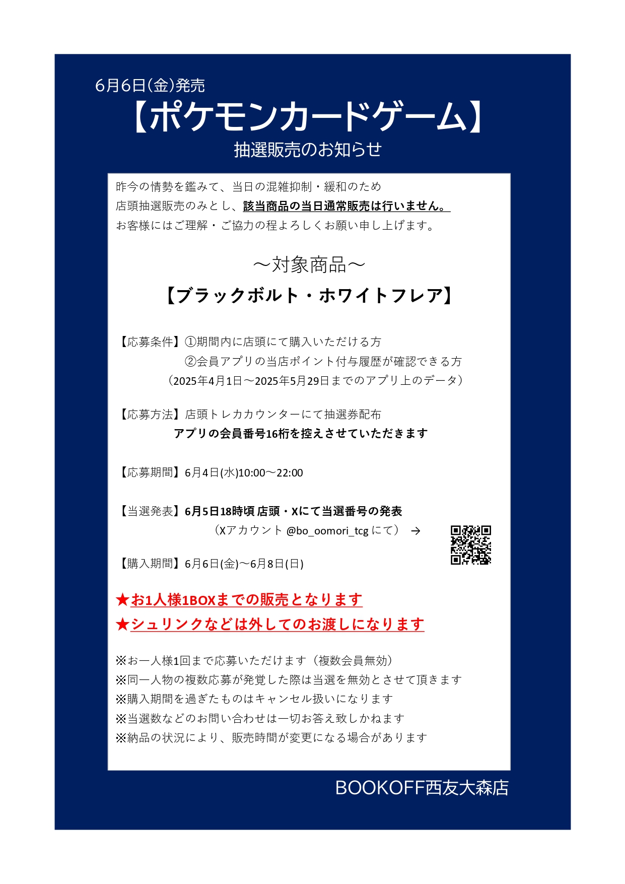 ブックオフ西友大森もブラックボルト、ホワイトフレア抽選開始