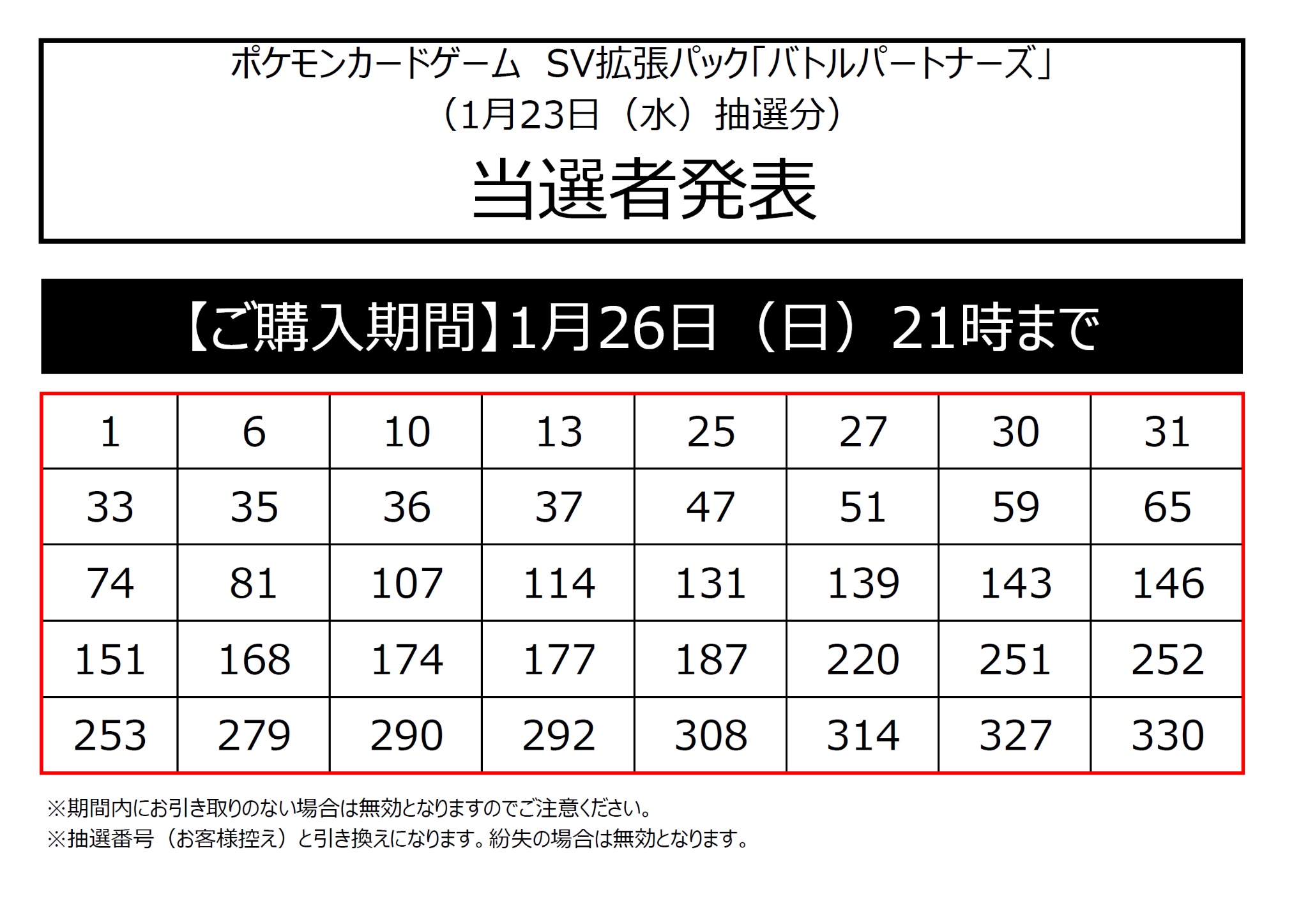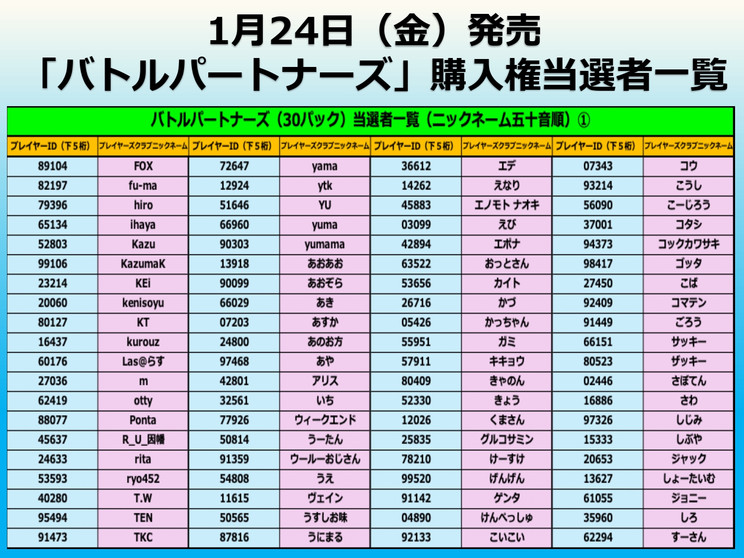 本日の「バトルパートナーズ」抽選結果発表の店舗一覧です。