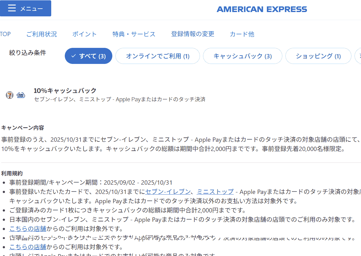 ちなみに、Amexの一部カードでセブン、ミニストップは今月いっぱい10%キャッシュバックキャンペーンやっています!