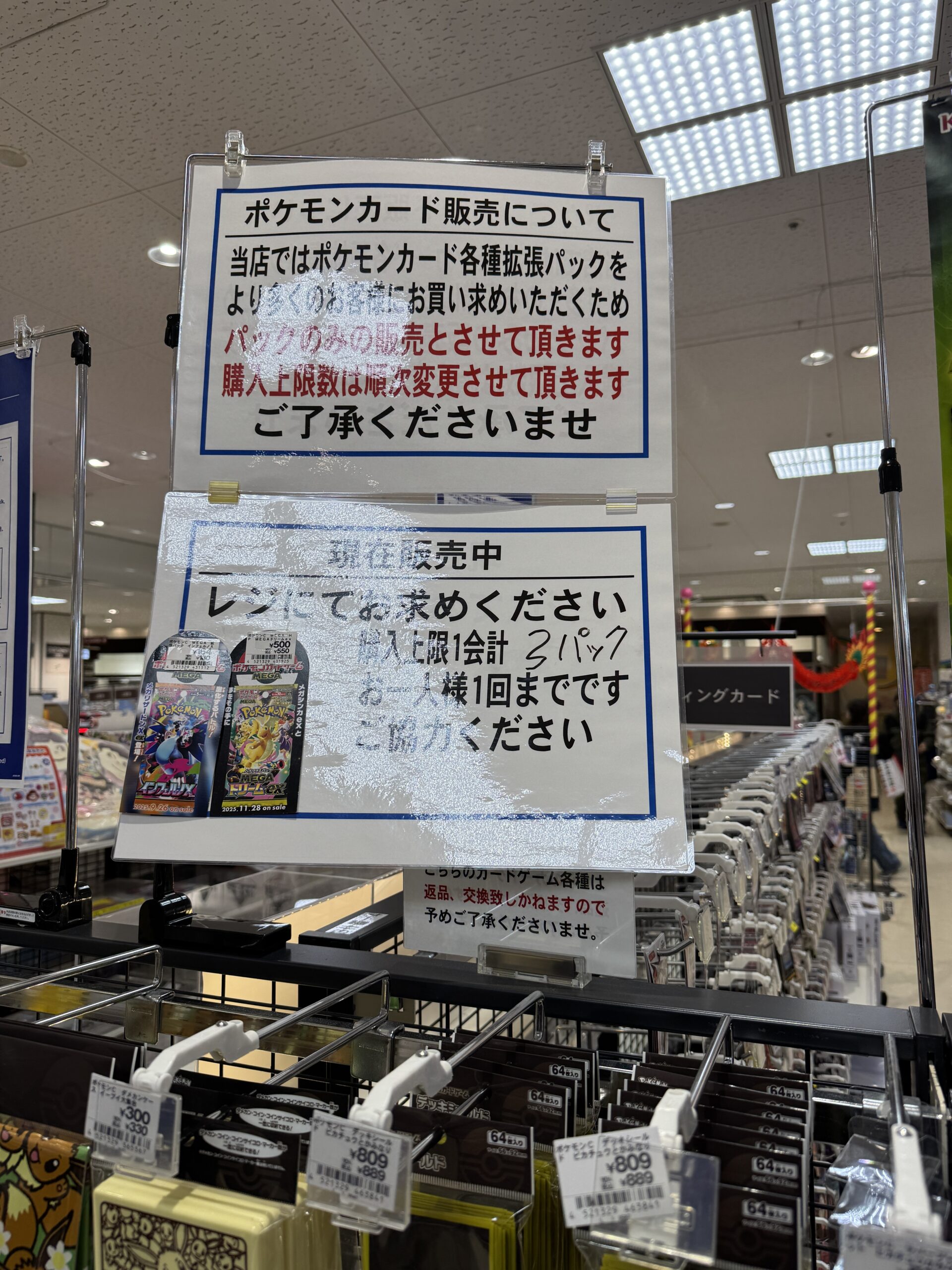 ヨドバシ、ビックカメラ以外の大手量販店やコンビニエンスストアなどの店舗でも、毎週の様にポケモンカード、ワンピースカード、遊戯王カードの店頭販売が行われています!