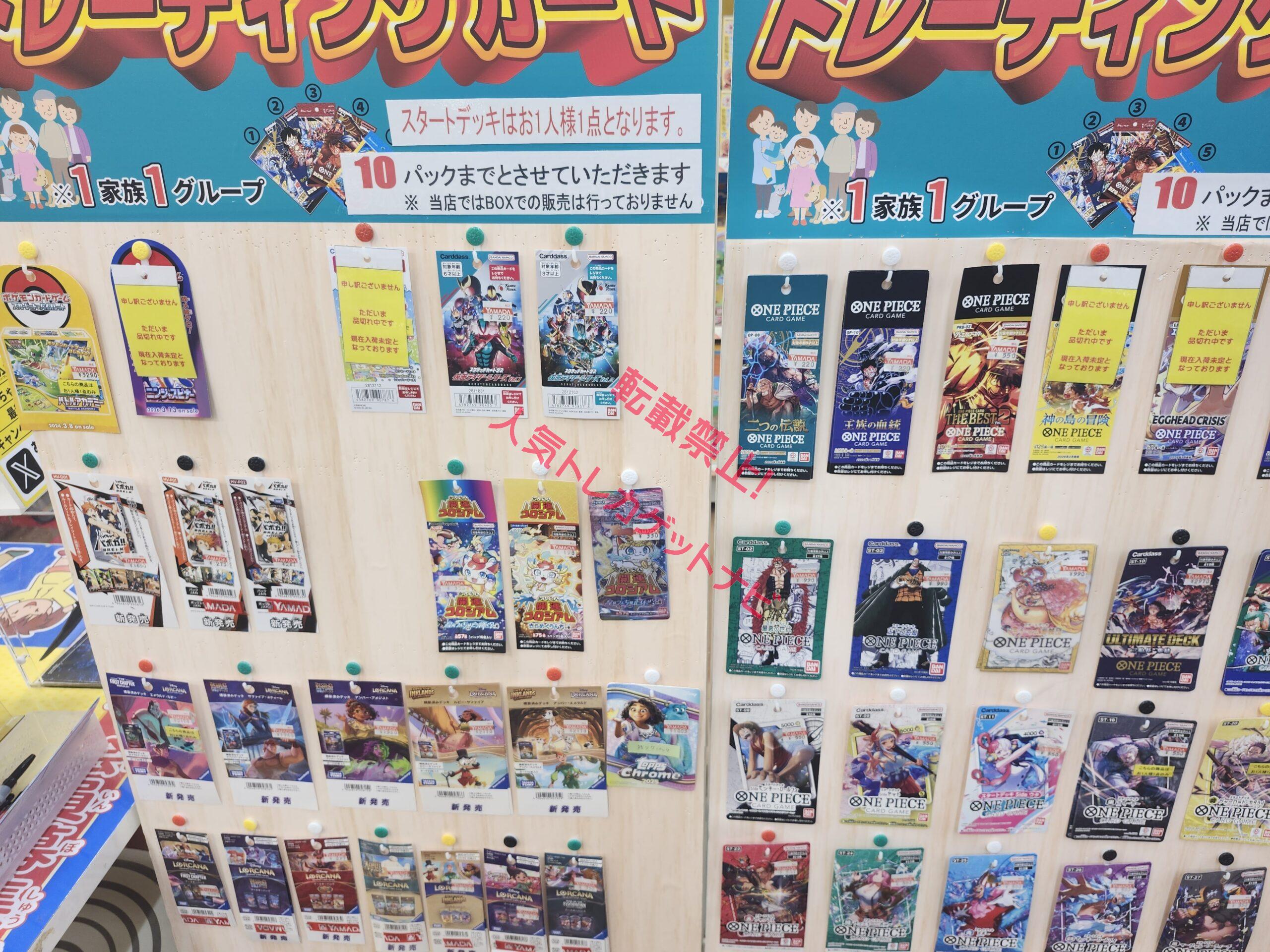 ヨドバシ、ビックカメラ以外の大手量販店やコンビニエンスストアなどの店舗でも、毎週の様にポケモンカード、ワンピースカード、遊戯王カードの店頭販売が行われています!