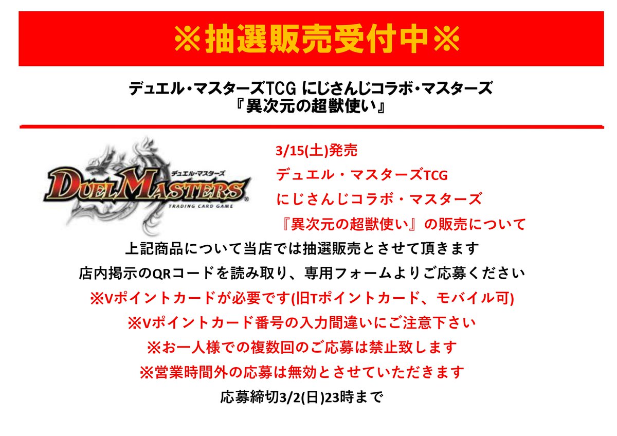 TSUTAYA西友町田店、デュエルマスターズにじさんじコラボパックを抽選販売との事。