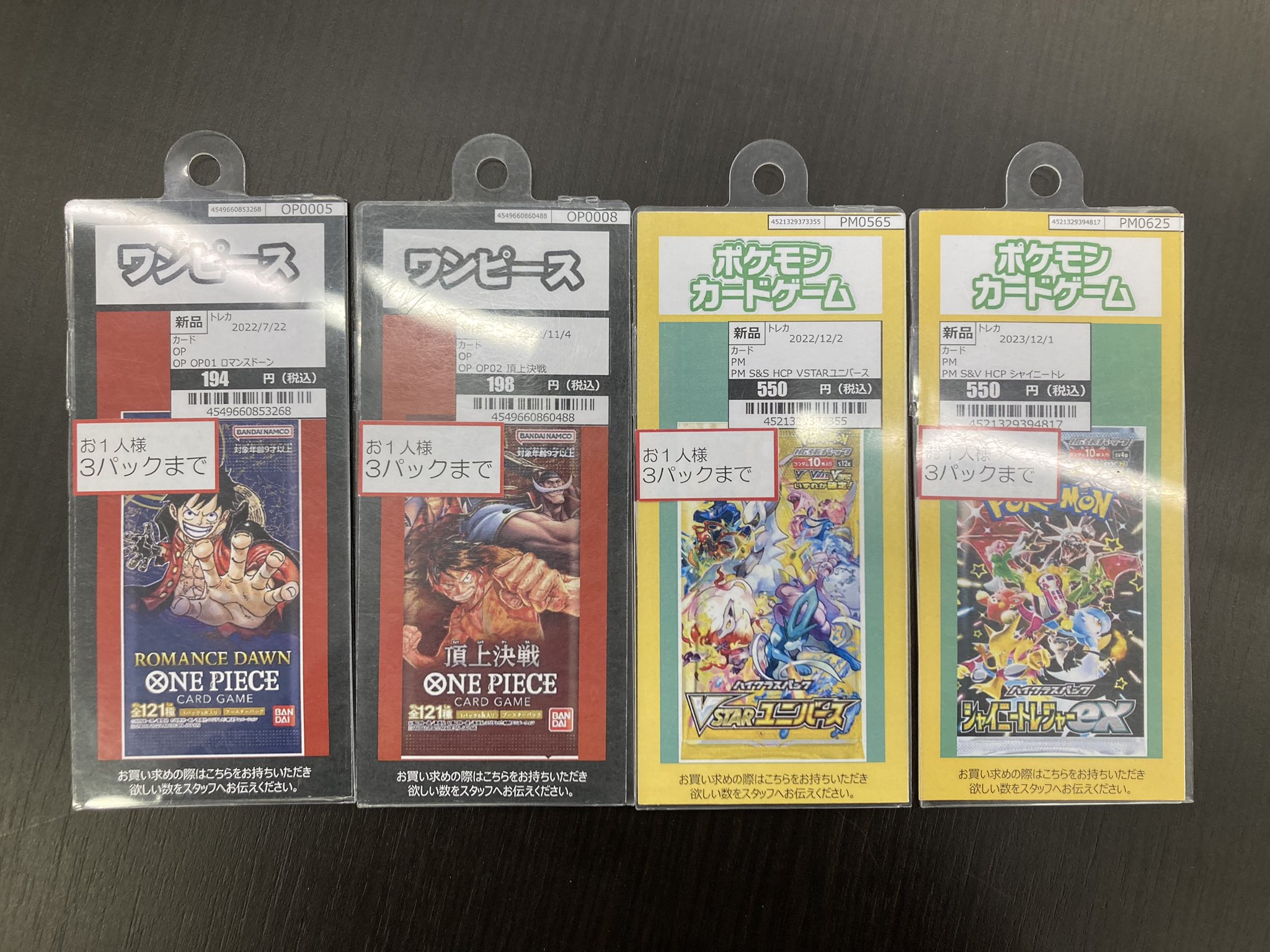 ヨドバシ、ビックカメラ以外の大手量販店やコンビニエンスストアなどの店舗でも、毎週の様にポケモンカード、ワンピースカード、遊戯王カードの店頭販売が行われています!