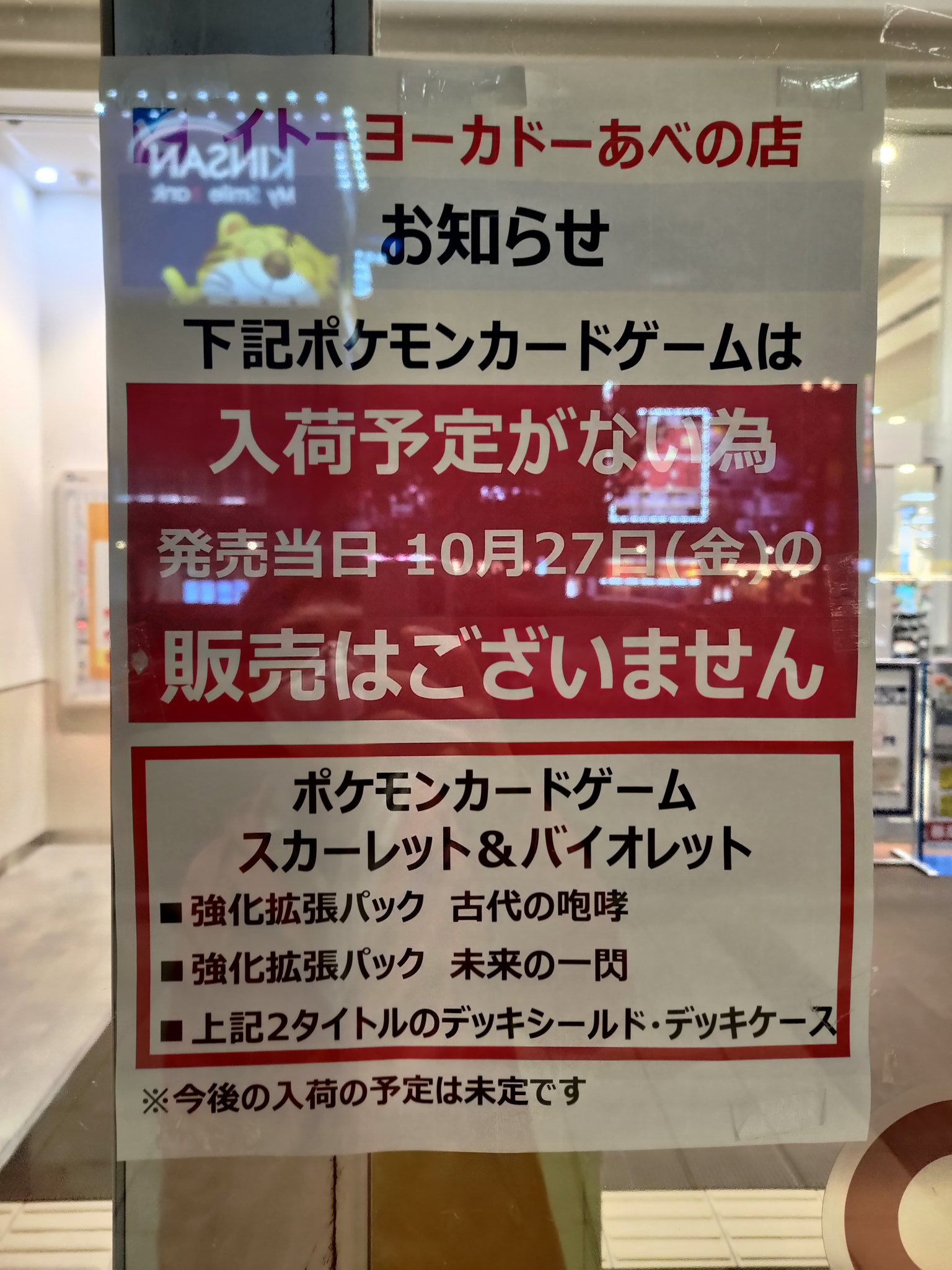 新弾発売日に、転売屋同士で格闘現場となった「イトーヨーカドーあべの」ですが、本日は、新弾の販売は行わないそうです。転売屋のせいで、有名になりすぎた店舗ですね。あの転売屋の日本人も有名になりましたが。