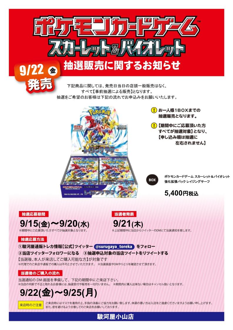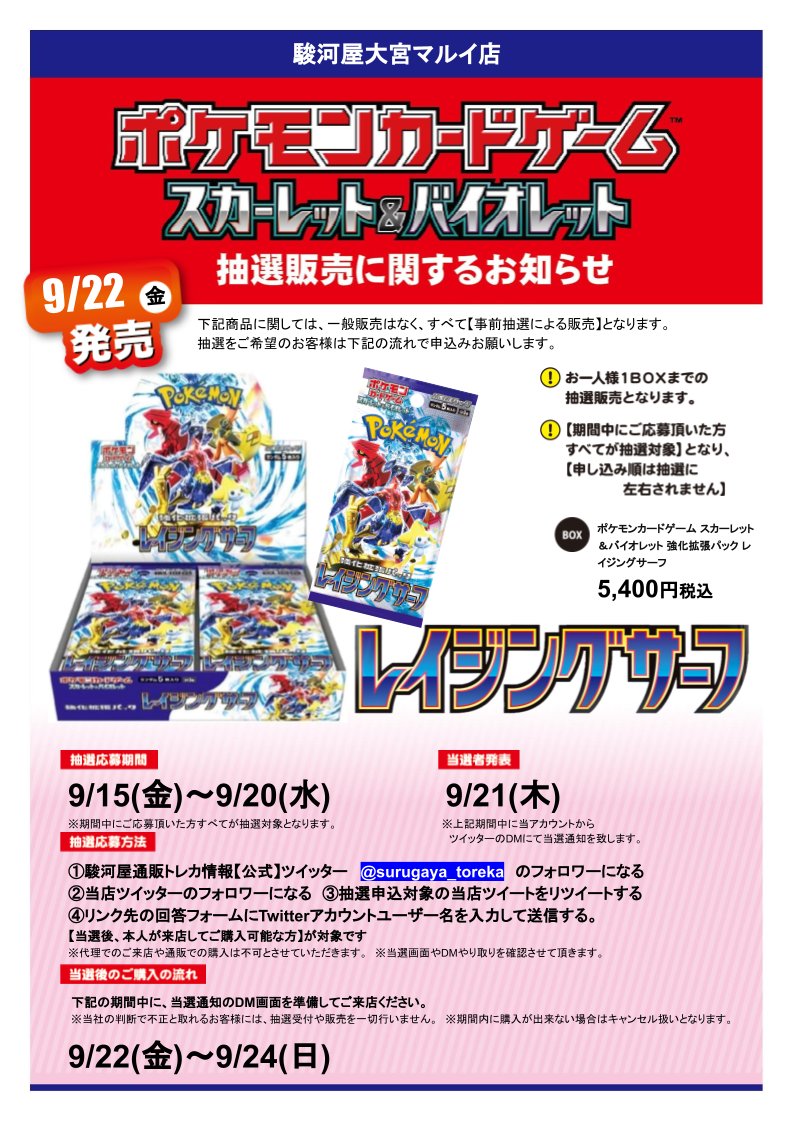 9/22発売 ポケモンカードゲーム #レイジングサーフ抽選販売のお知らせ応募方法1⃣当店アカウント@SurugayaAobadaiをフォロー2⃣この投稿をリポスト 3⃣下記回答フォームへアカウント名等入力当選発表 当選者へDM送付(9/20以降随時) 是非ご参加下さい⚡