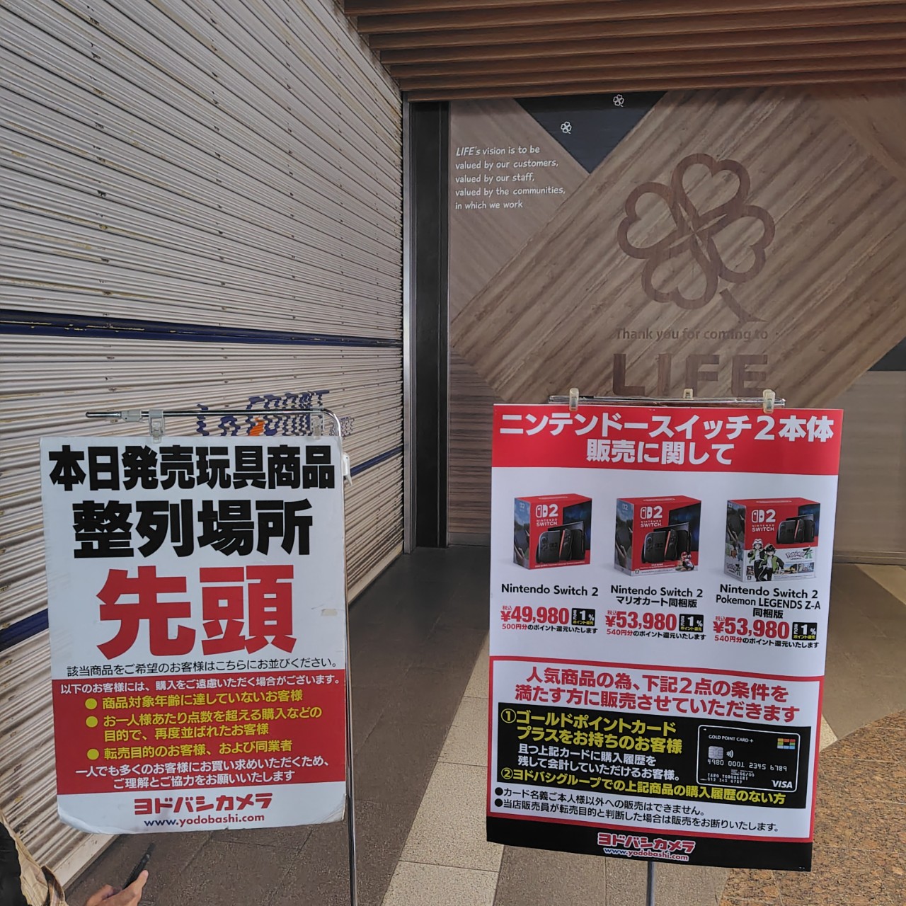 新宿西口、10/18朝のSwitch2販売はありませんとのこと。店前に看板が置いてありました。